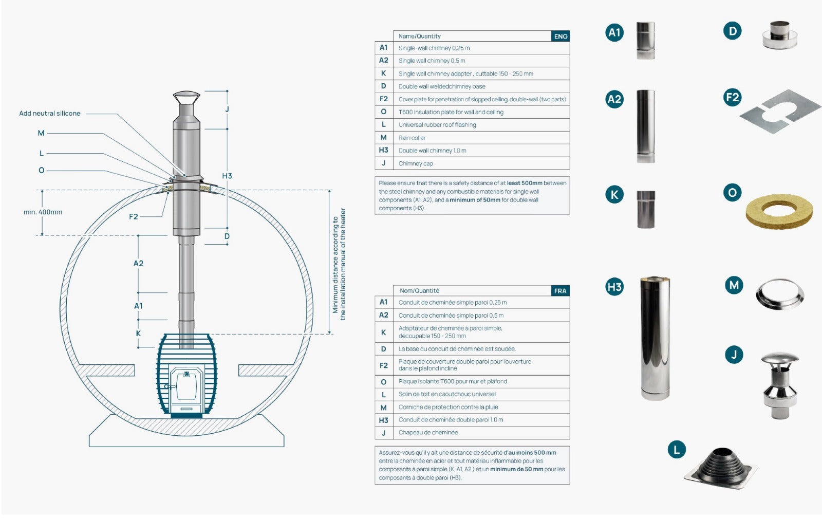 Inkluderar skorsten, skyddspatta för golv, samt bastusten.