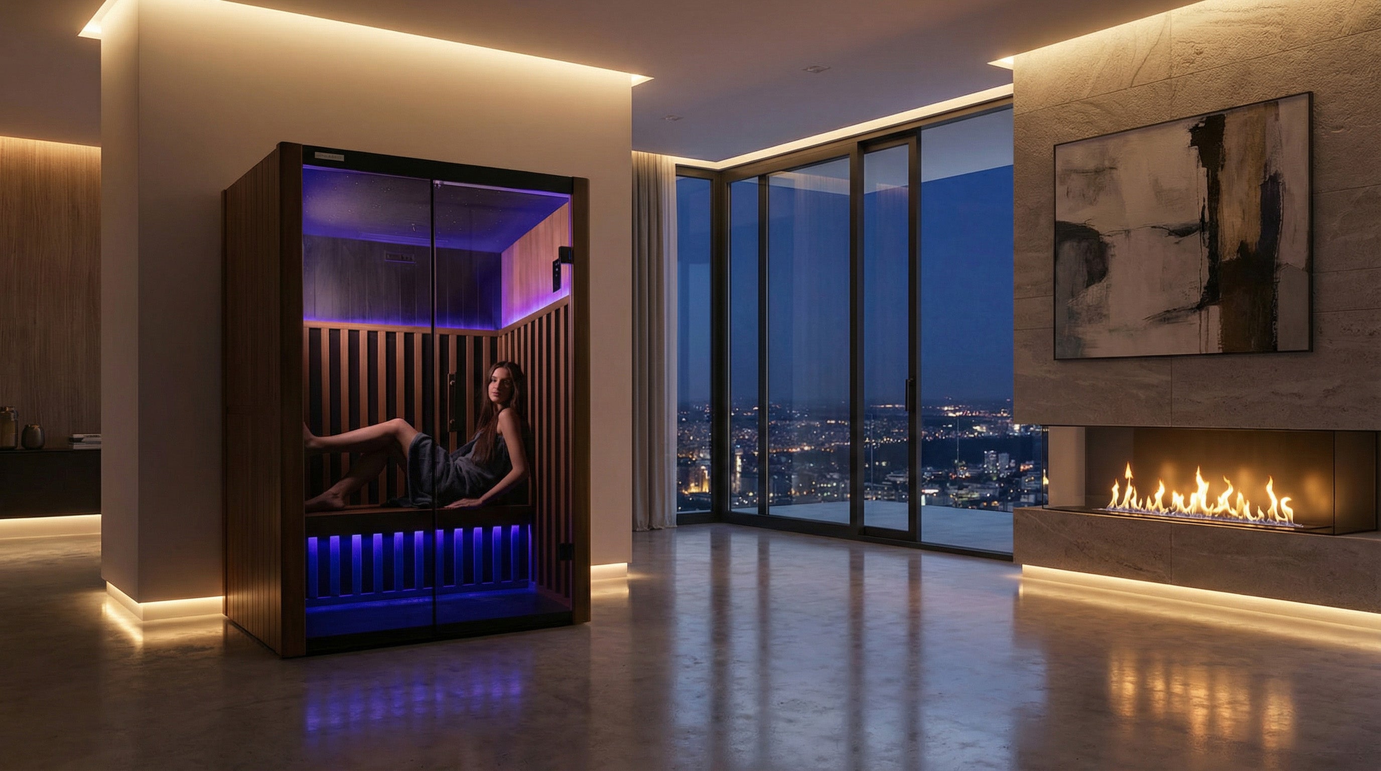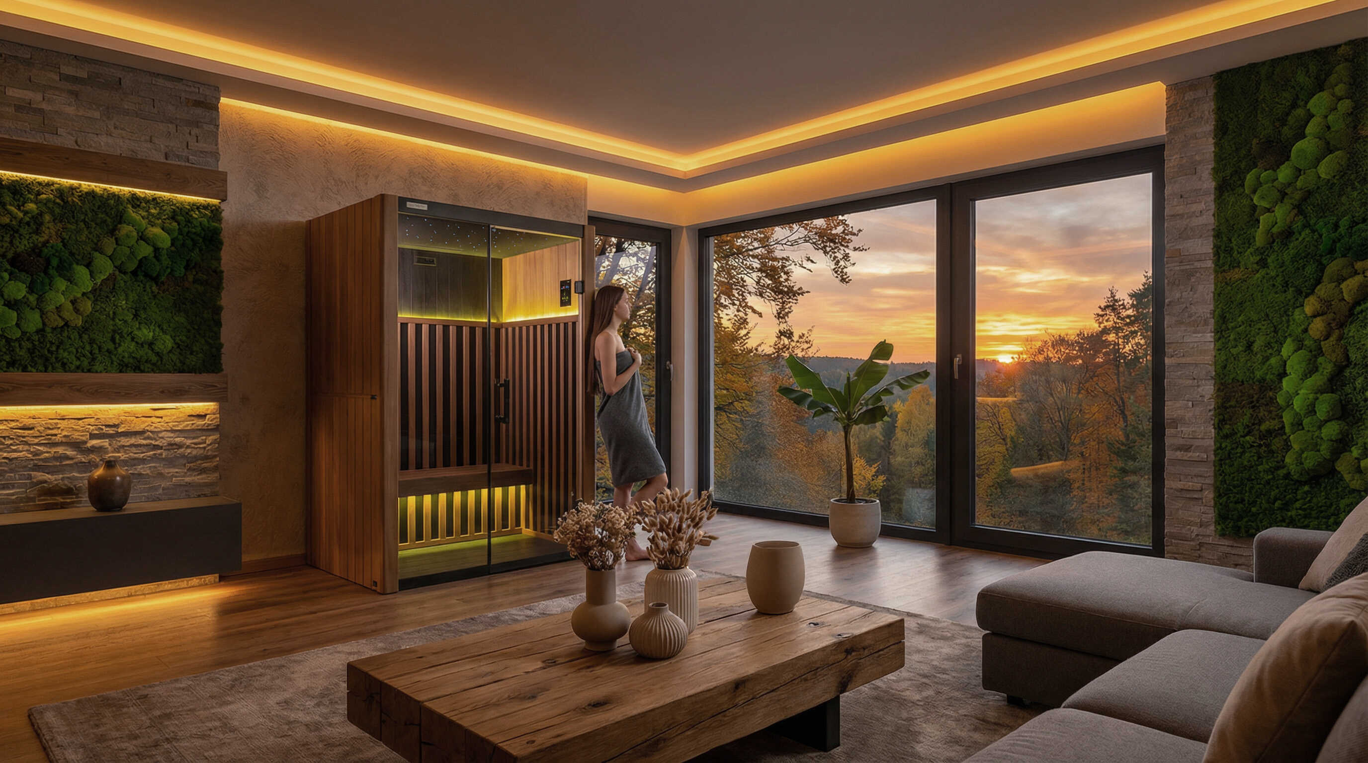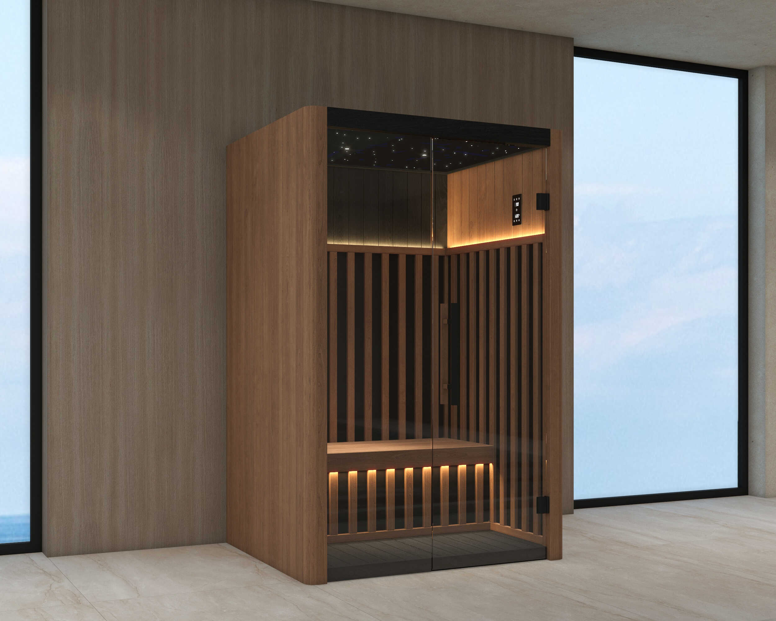 Premium infraröd inomhusbastu för 2 personer från OKA Design-serien, tillverkad av termiskt modifierat Thermo Ayous-trä och mörk Thermo Abachi, med ett modernt infrarött värmesystem med nano-kolfolie och IR-C-sändare med en total effekt på 2170 W. Bastun är utrustad med ett stjärntak med svart bas, en PTAT-kontroller, en pekskärm och Wi-Fi-anslutning via Smart Life-appen. Den erbjuder en bekväm enkel bänk kompletterad med en kjolpanel med stämningsbelysning, dekorativ beklädnad av värmepanelerna med integrerad belysning, en svart bastuvaxfinish på utsidan och undersidan, svart handtag och gångjärn samt 6 mm mörkgrått härdat glas.