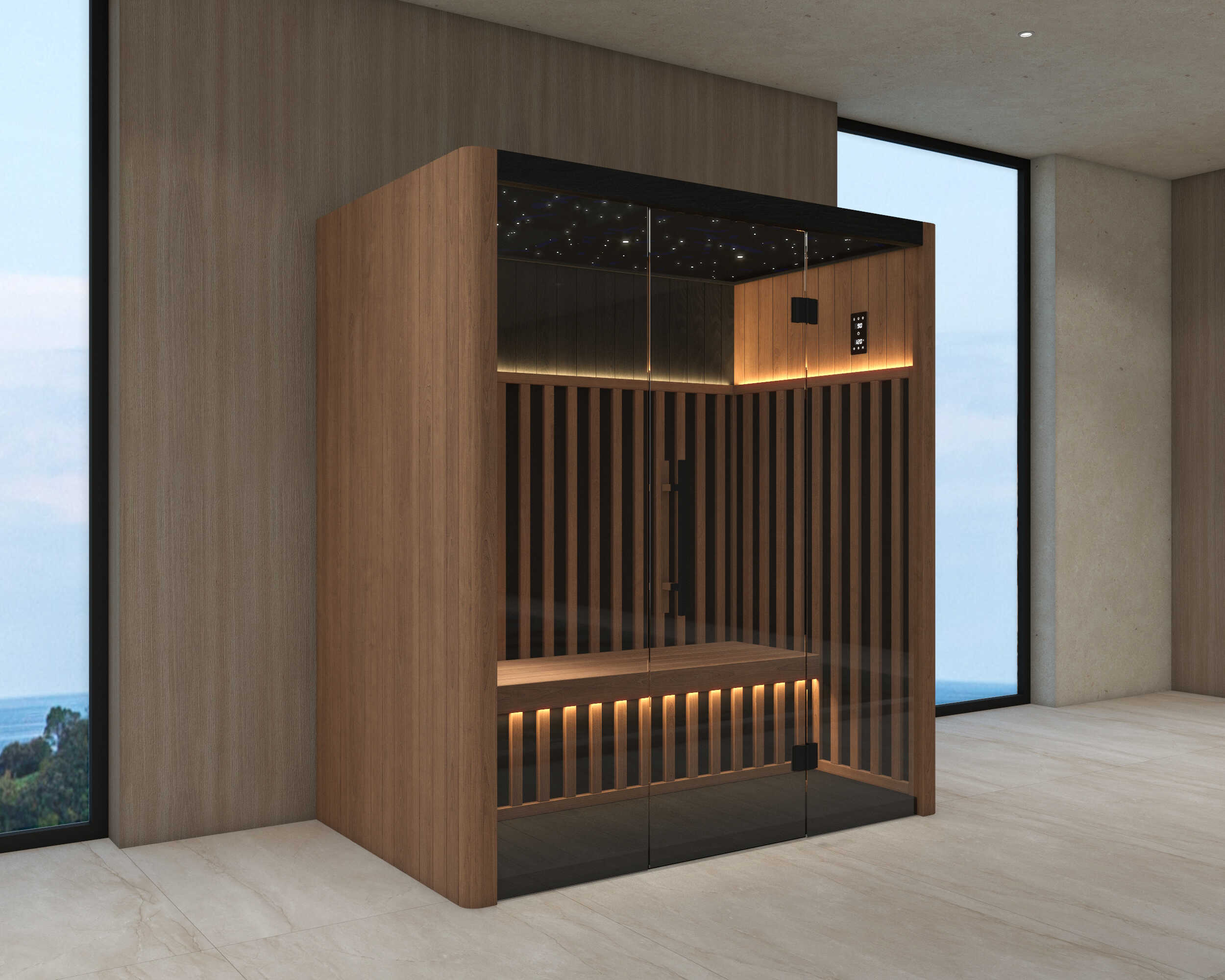 Premium infraröd inomhusbastu för 3 personer från OKA Design-serien, tillverkad av termiskt modifierat Thermo Ayous-trä och mörk Thermo Abachi, med ett modernt infrarött värmesystem med nano-kolfolie, ett stjärntak med svart bas, stämningsbelysning, en PTAT-kontroller, en pekskärm och Wi-Fi-anslutning via Smart Life-appen. Bastun är behandlad med svart bastuvax på utsidan och undersidan, kompletterad av svarta handtag och gångjärn och 6 mm grått härdat glas.