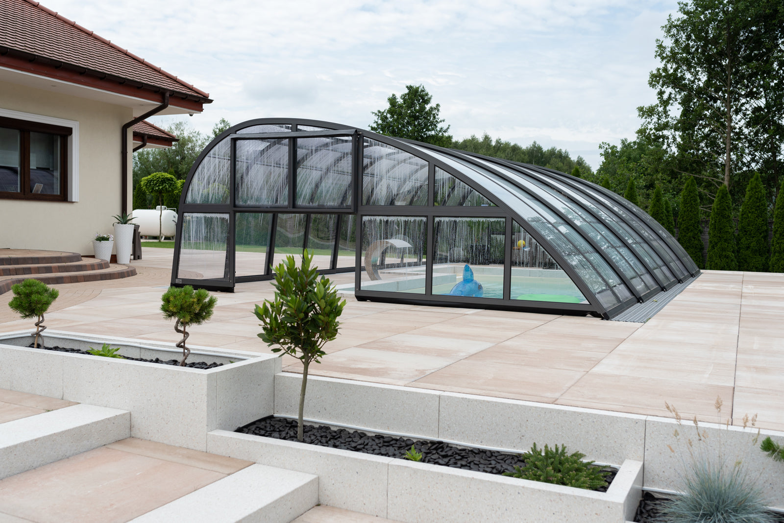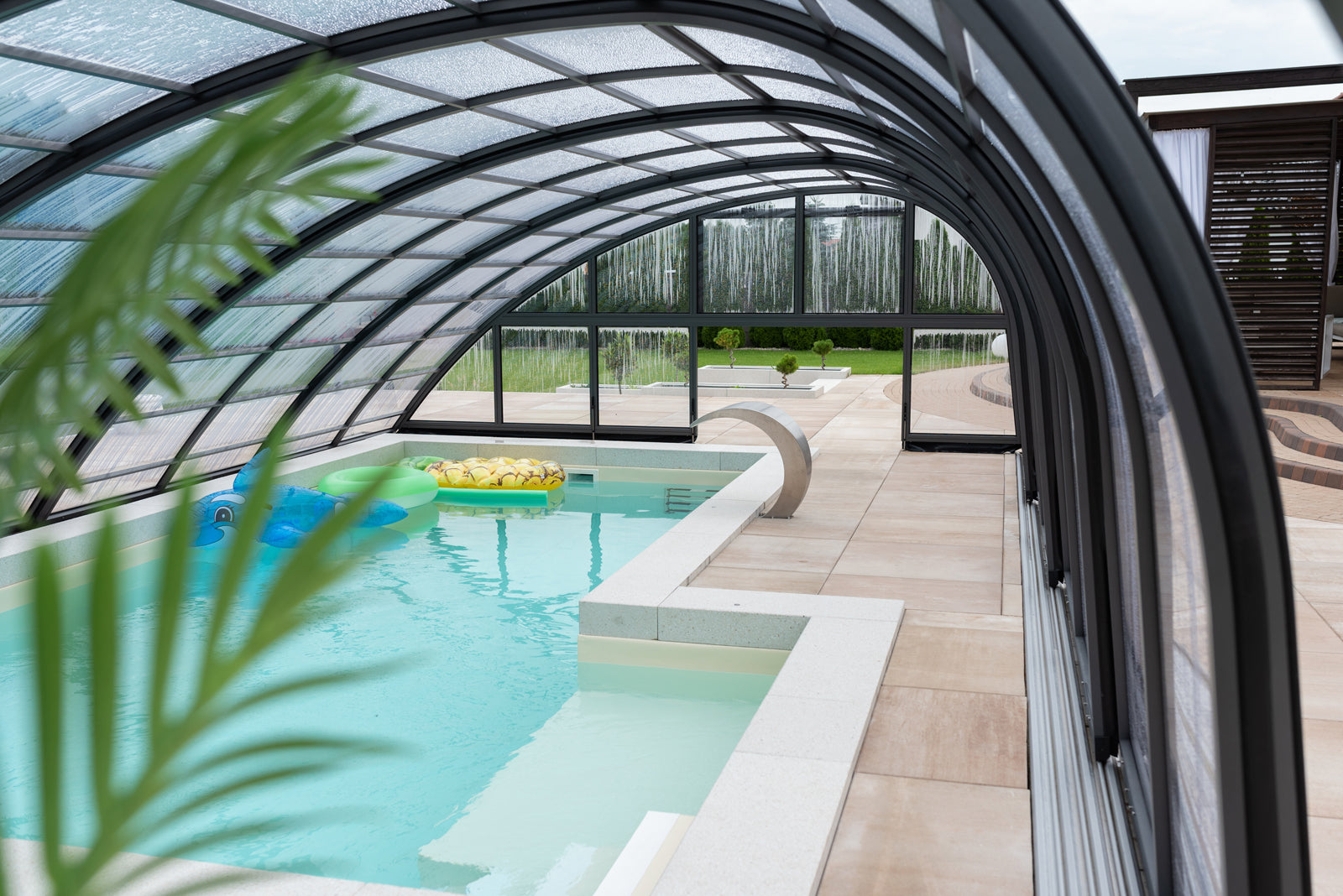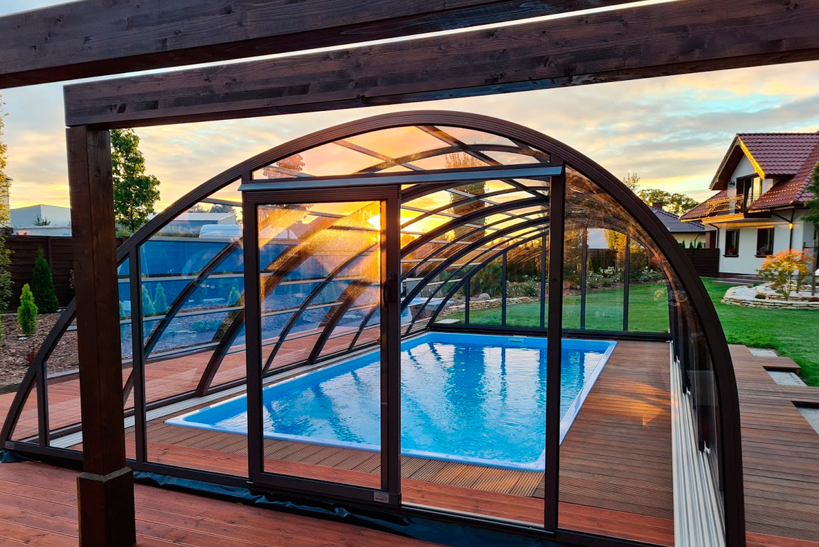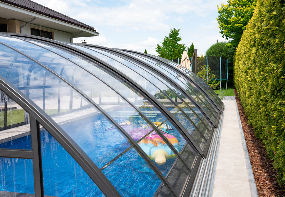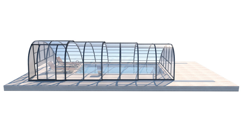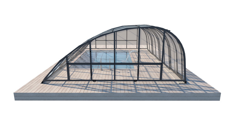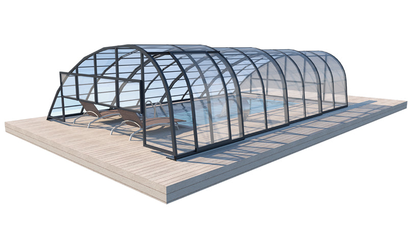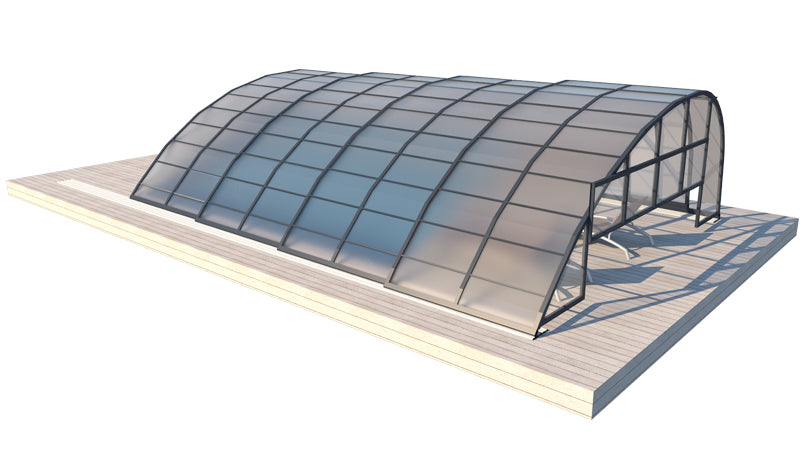 Panorama är ett robust tak med väldigt kraftig stomme i hela 57 x 42 mm. Pooltaket har som standard skjutbar sidodörr som gör att man når sin stege eller trappa på enkelt sätt. En attraktiv form av pooltak med möjlighet att justera höjden efter behov upp till 2,5 m. Du kan bekvämt röra dig i poolen under taket. Pooltaken är framtagna för att passa våra glasfiberpooler.