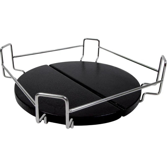 Vill du tillaga kyckling indirekt eller röka lax, långsamt tillaga stora köttbitar eller steka revbensspjäll och pulled pork? Då är plattstället (värmeavledaren) något för dig. Denna keramiska värmeplatta förvandlar The Bastard till en ugn. Ditt kött, dina grönsaker eller din fisk tillagas jämnt, utan längre risk för brännskador. Också viktigt för att göra de godaste pizzorna i kombination med en pizzasten. Platstället i keramik består av två delar: hållaren i rostfritt stål och en separat rund sten tillverkad av kordieritkeramik.