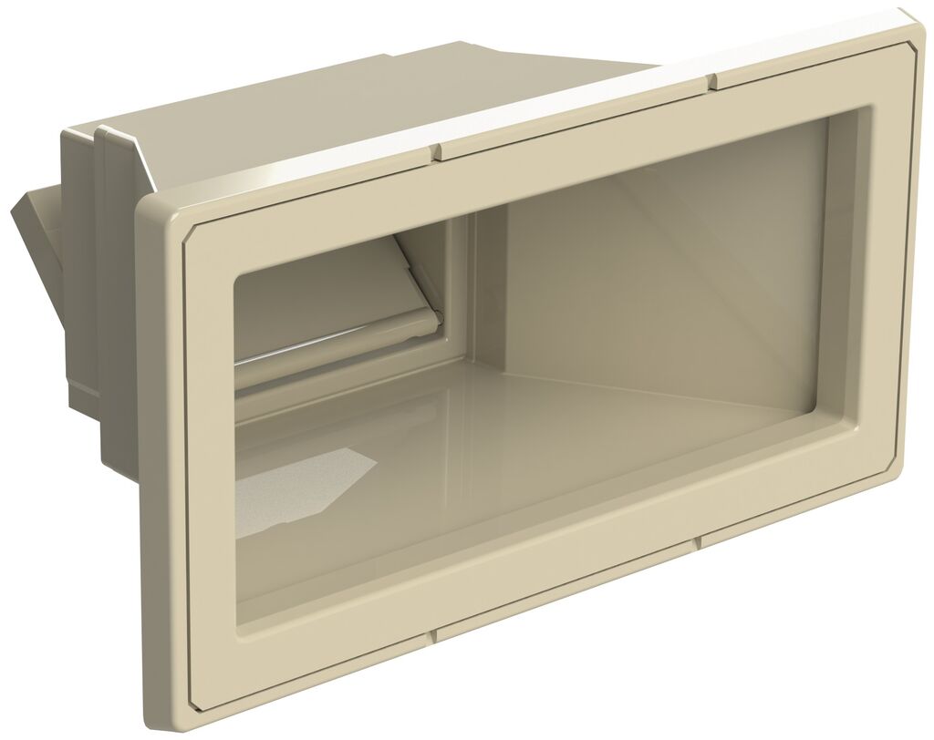 Den nya insatsen med klafflucka trycks enkelt in i skimmern och sedan skruvas den nya fronten på.