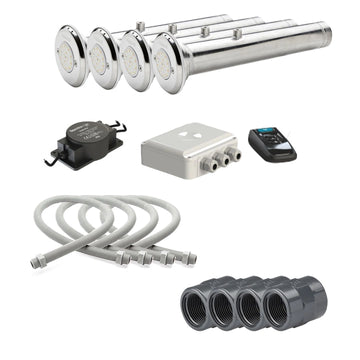 Belysninsgpaket Spotlights Classic VS-RGB med 4 st spotlights 8W, 4 st kabelrör, 1 st kontrollbox med fjärrkontroll, 1 st transformator